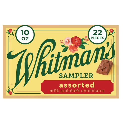 Whitman’s Sampler is a classic American boxed chocolate assortment featuring a variety of milk and dark chocolates, creams, nougats, nuts, and flavored chocolates like cherry cordials and coconut bonbons.